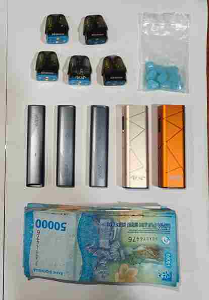Dari tangan tersangka DLH, petugas menyita barang bukti berupa 10 butir pil ekstasi warna biru berlogo “Rolex”, 5 cartridge liquid vape merek Sidepiece Vape yang mengandung zat narkotika jenis MDMB-4en-PINACA, 3 buah vape warna hitam merek Veev, 1 buah vape warna putih merek Sidepiece, 1 buah vape warna oranye merek Sidepiece, uang tunai sebesar Rp4.500.000,-, serta satu unit handphone yang diduga digunakan dalam transaksi jual beli narkotika tersebut.