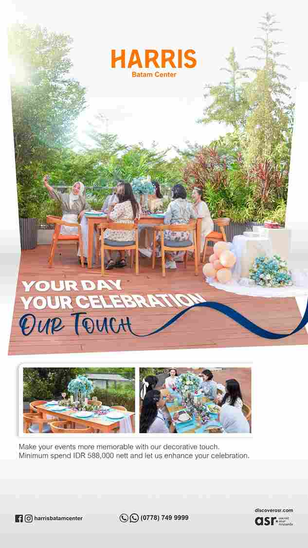 Dalam upaya untuk memenuhi kebutuhan masyarakat yang semakin menghargai momen spesial dalam hidup, Harris Batam Center meluncurkan kampanye eksklusif bertema “Your Day, Your Celebration, Our Touch”, yang menawarkan sentuhan dekoratif elegan untuk berbagai acara penting seperti ulang tahun, arisan, pertemuan keluarga dan reuni teman dengan pembelian minimal Rp588,000 nett.