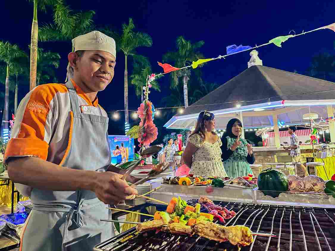 Menu utama acara ini adalah buffet BBQ premium all-you-can-eat yang dirancang khusus oleh eksekutif koki resor. Tamu akan dimanjakan dengan beragam hidangan panggang segar yang dimasak langsung di live cooking station. Mulai dari daging sapi premium seperti Rib-Eye Beef, Sirloin, dan Shortcut Rib, hingga hidangan ayam seperti Honey Soy Chicken Wings dan Chicken Chop, semuanya dipanggang dengan bumbu khas yang menggoda selera. Tersedia juga pilihan makanan laut seperti Fish Brochette dan berbagai sayuran yang ditusuk dan dipanggang—cocok untuk pecinta makanan sehat.