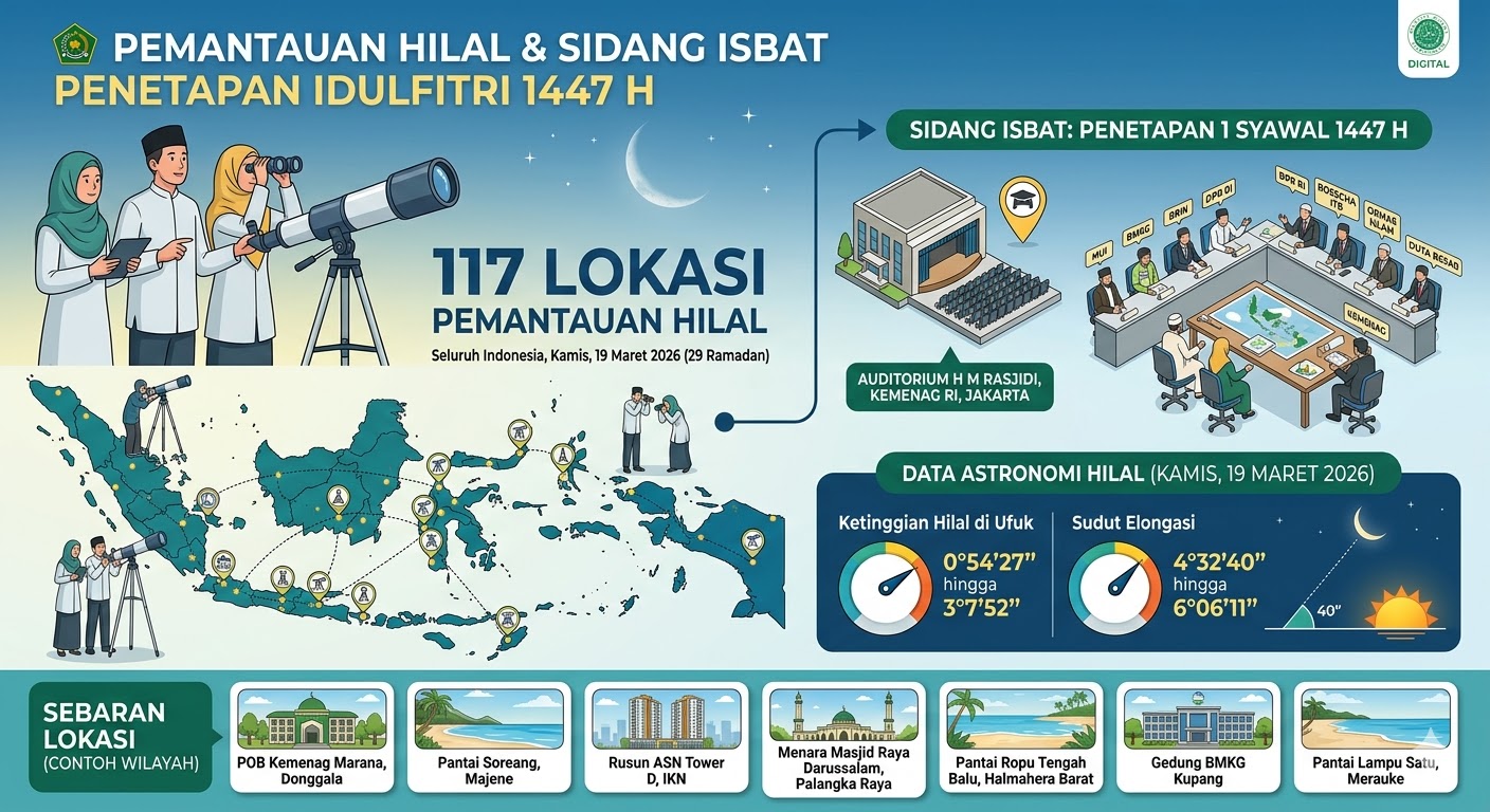 Prawarakepri, Jakarta – Kementerian Agama (Kemenag) RI menjadwalkan pemantauan hilal (rukyatulhilal) di 117 lokasi di seluruh Indonesia pada Kamis, 19 Maret 2026. Langkah ini diambil untuk menentukan awal Syawal 1447 Hijriah atau Hari Raya Idulfitri.
