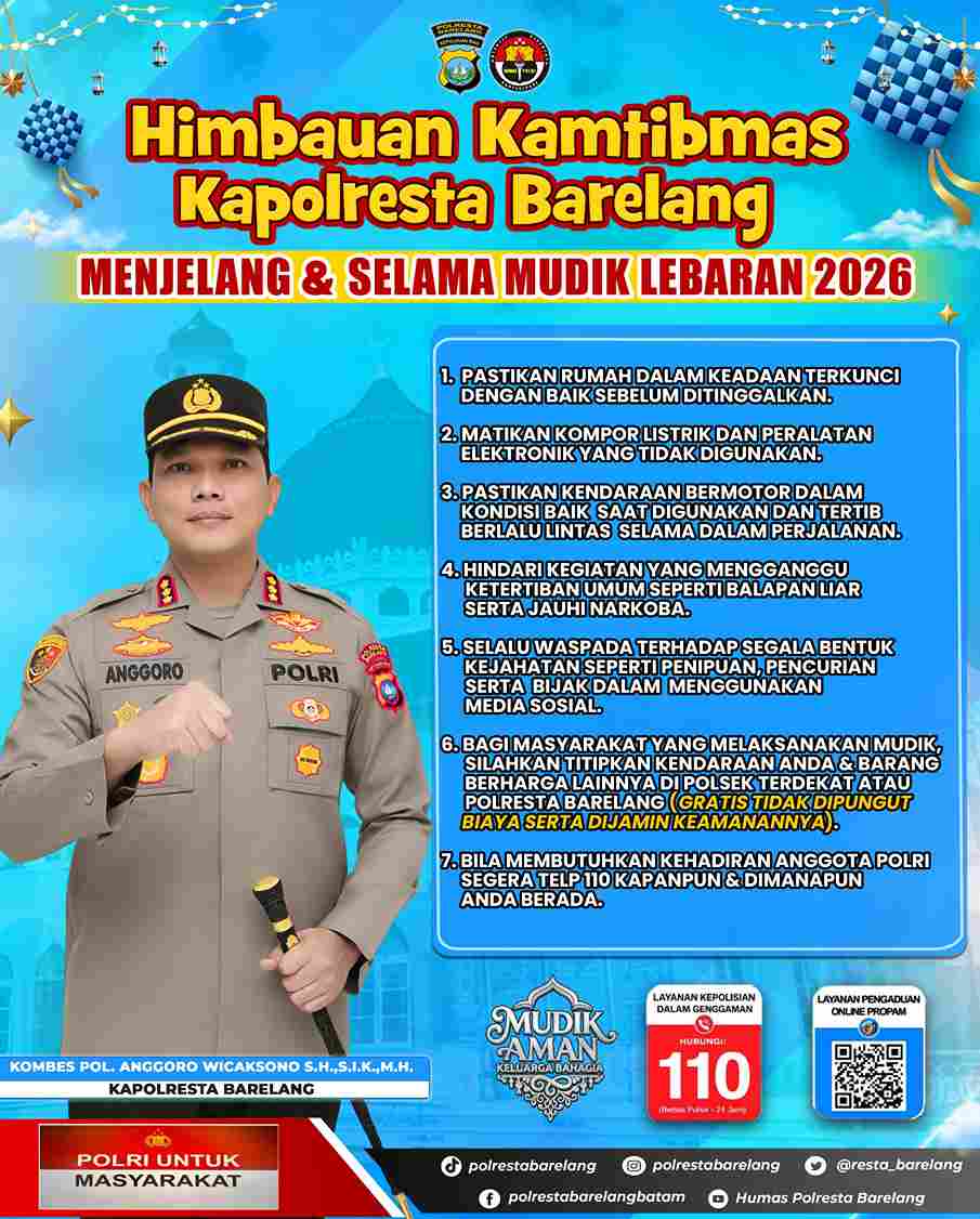 PRAWARAKEPRI.COM BATAM, – Menjelang perayaan Hari Raya Idulfitri 2026, Kapolresta Barelang Kombes Pol Anggoro Wicaksono, S.H., S.I.K., M.H., mengeluarkan himbauan kamtibmas kepada seluruh masyarakat agar tetap menjaga keamanan dan ketertiban selama pelaksanaan mudik Lebaran.